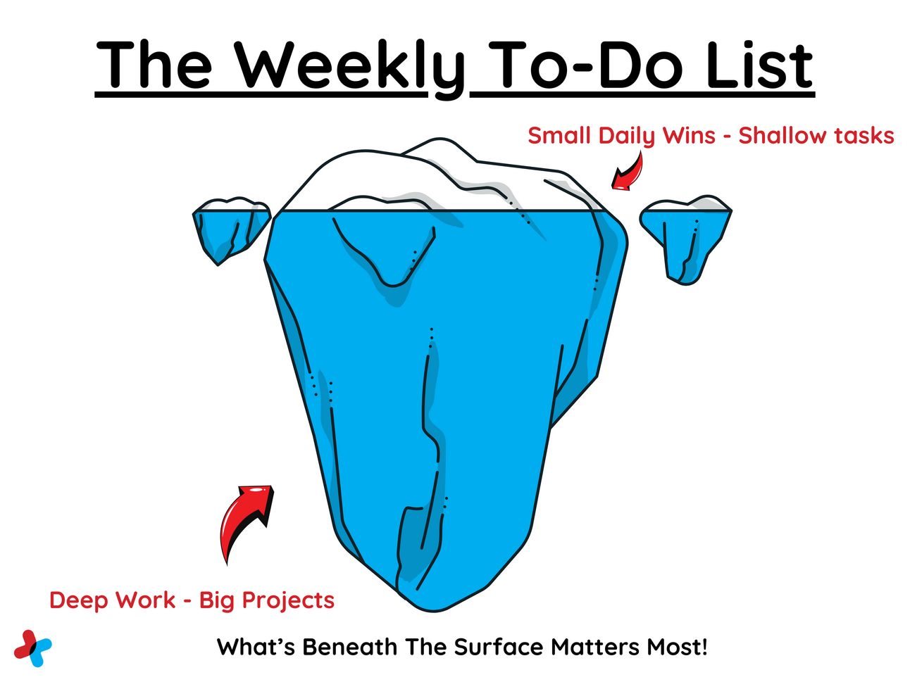 The small, visible tip above the surface represents tiny, shallow daily wins (emails, errands, quick tasks).